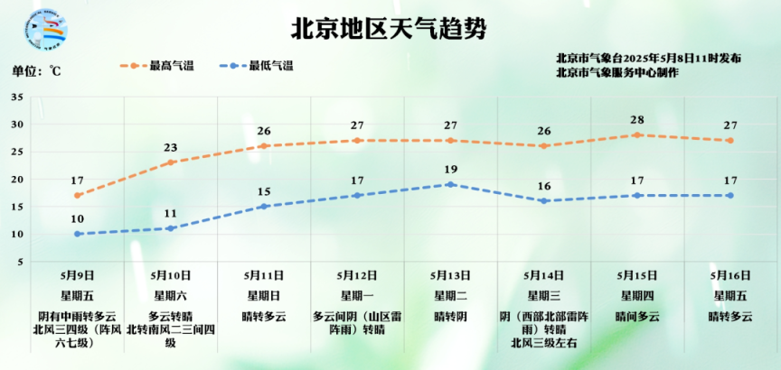 北京市气象台5月9日9时发布:今天白天阴有中雨,局地有大雨到暴雨,北风二级转三四级(阵风六七级),最高气温13℃;夜间阴有阵雨转多云,北风二三间四级,最低气温10℃。今天有明显降水过程,气温大幅下降,北风较大,大风蓝色预警中,出行增添衣物,防风防雨,注意交通安全。